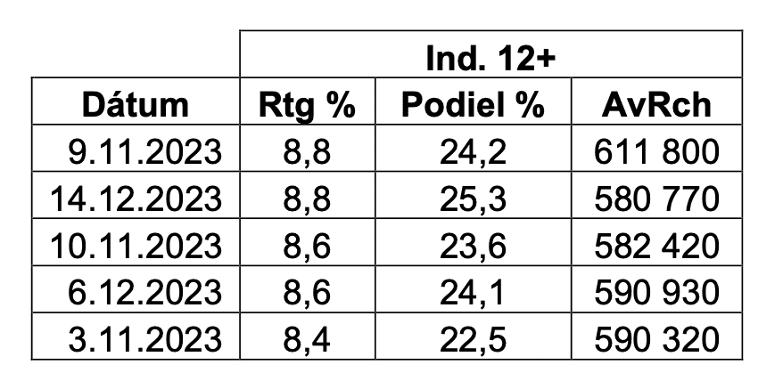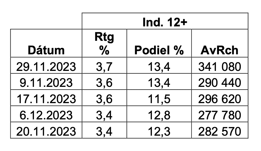 si šou nenechali ujsť muži vo veku 35-44 rokov (sledovanosť 9,7 %) a 5. decembra