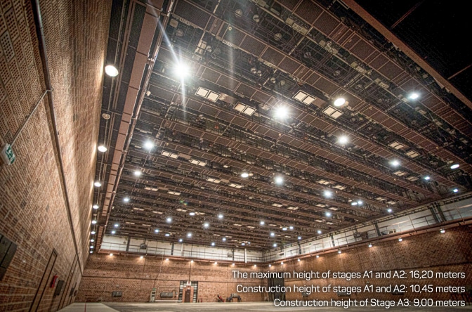 Stage A3 has got a total area of 1100 m2 and its construction height is 9 meters. It is suitable both for TV and film sets. In the area between Stage A3 and the neighboring stages A1 and A2, the facility includes dressing and make-up rooms, production rooms, toilets, and lifts to the second floor. Supporting areas also include two work rooms with large entry gates to Stage A3 that allow for the manipulation of technical equipment, the delivery of sets, the entry of automobiles including trucks, or as a background for production.