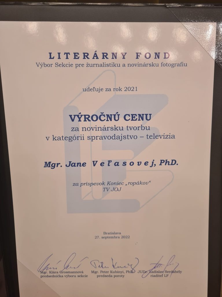 Reportérka televízie JOJ Jana Veľasová získala výročnú cenu Literárneho fondu za novinársku tvorbu v roku 2021 v kategórii spravodajstvo / televízia za reportáž s názvom Koniec „ropákov“. Ocenenie získala tretí rok po sebe.