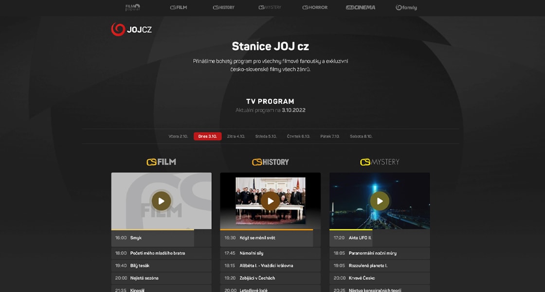 Menovite ide o stanice CS Film, CS History, CS Mystery, CS Horror, JOJ Family a JOJ Cinema. Spoločný web prináša kompletný prehľad týchto televízií a ich týždennú programovú štruktúru.