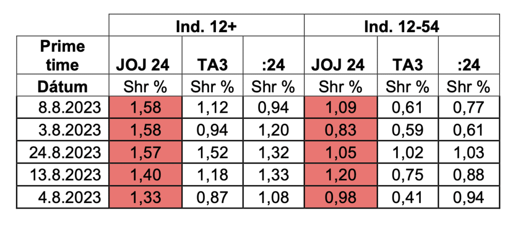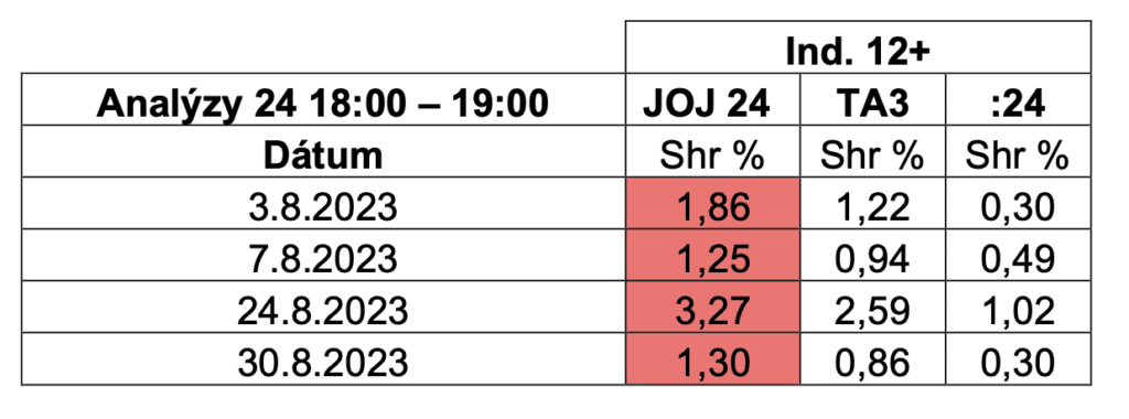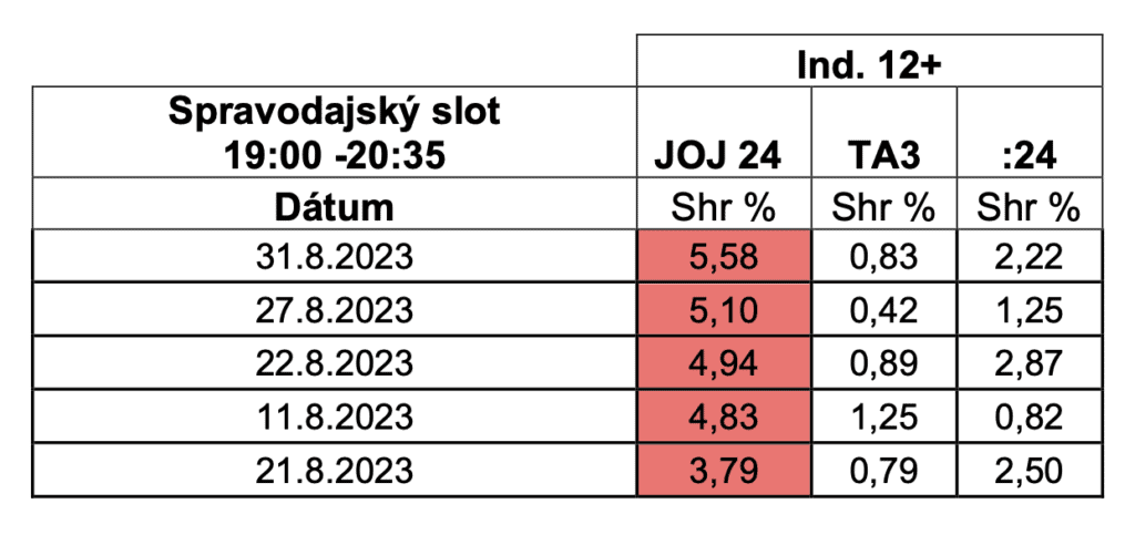 Mimoriadne úspešný je spravodajský blok JOJ 24 v hlavnom vysielacom čase. Za mesiac august bola JOJ 24 v čase od 19:00 do 20:35 v priemere jednotkou na trhu v CS 12-54 aj v CS 12+. V cieľovej skupine 12+ aj v 12-54 bol tento slot 23-krát najsledovanejší a zároveň dosiahol najvyšší podiel v porovnaní so stanicami TA3 a :24.